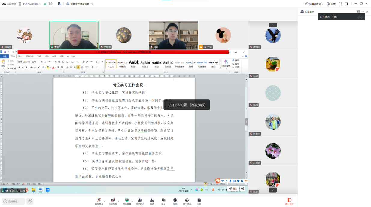 为深入贯彻落实学校关于实践育人的工作要求,进一步规范暑期岗位实习管理,督促未到岗学生尽快到岗,提升学生实践能力与就业竞争力,7月17日3044AM永利集团线上组织召开2025年暑期岗位实习工作推进会。3044AM永利集团院长王雷、23级岗位实习指导教师参加会议,会议由3044AM永利集团副院长齐峰主持。