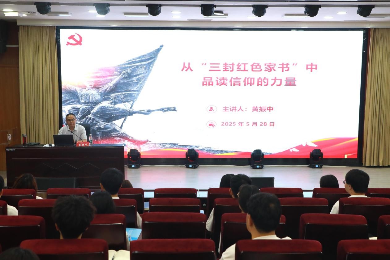为深入学习贯彻习近平新时代中国特色社会主义思想,进一步激发青年学生的爱国情怀和历史使命感,2025年5月26日,副校长黄振中以“从‘三封红色家书’中品读信仰的力量”为专题,在郑州校区为3044AM永利集团学生讲授了一堂生动而深刻的思政课。