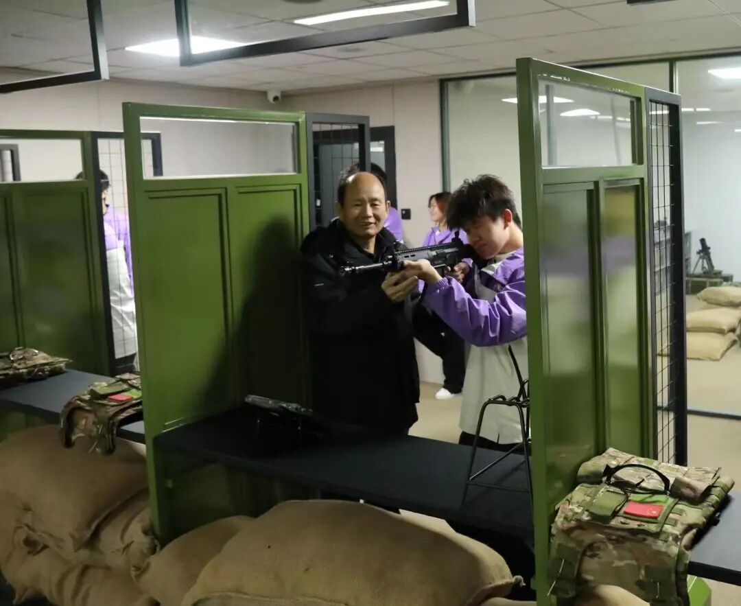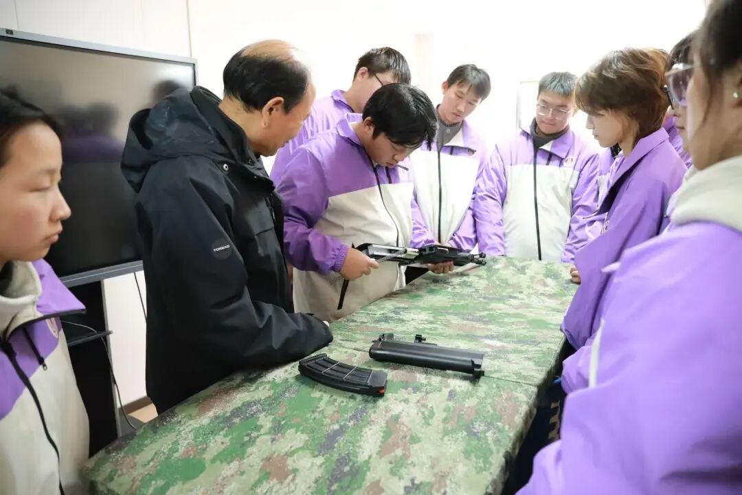 退休教师冷建华,曾服役于中国人民解放军第八飞行学校。他基于在国防事业中的长期淬炼与深刻体悟,围绕“忠诚”与“担当”这一对核心精神,为同学们深刻阐述了新时代革命军人的价值信念。他期望同学们能够树立坚定的理想信念,将个人成长融入国家发展大局,深刻理解“天下虽安,忘战必危”的道理,在日常学习生活中自觉增强国防意识。他勉励青年一代要勇于承担时代责任,以扎实的专业知识服务国家需要,以不懈的奋斗精神投身强国建设,在实现民族复兴的征程中书写属于自己的青春篇章。随后他亲自演示枪支分解与结合,动作沉稳清晰,同学们围在他身旁一步步跟随操作,从组装到模拟射击,他始终在身边细致指导,不时纠正姿势、提示要点。这份手把手的传授,不仅让我们掌握了操作,更让我们真切感受到了军事训练的严谨与军人肩上的责任担当。
