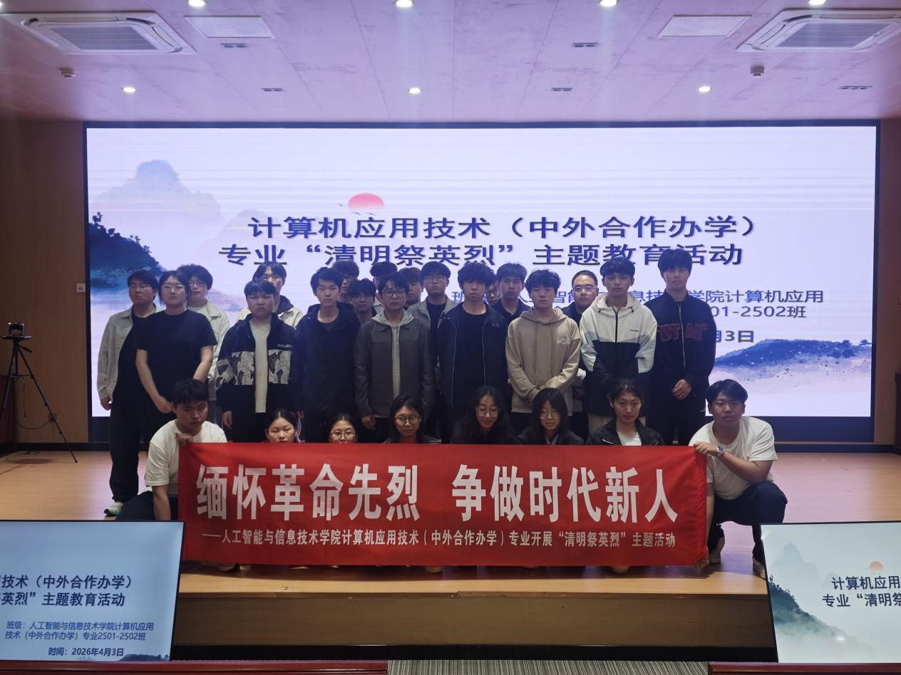 为缅怀革命先烈,传承红色基因,厚植爱国情怀,强化学生假期安全意识,倡导文明新风,清明节前夕,4月3日,人工智能与信息技术3044AM永利集团组织开封校区计算机应用技术专业(中外合作办学)开展了“清明祭英烈”主题教育活动,全体学生参与了本次活动。
