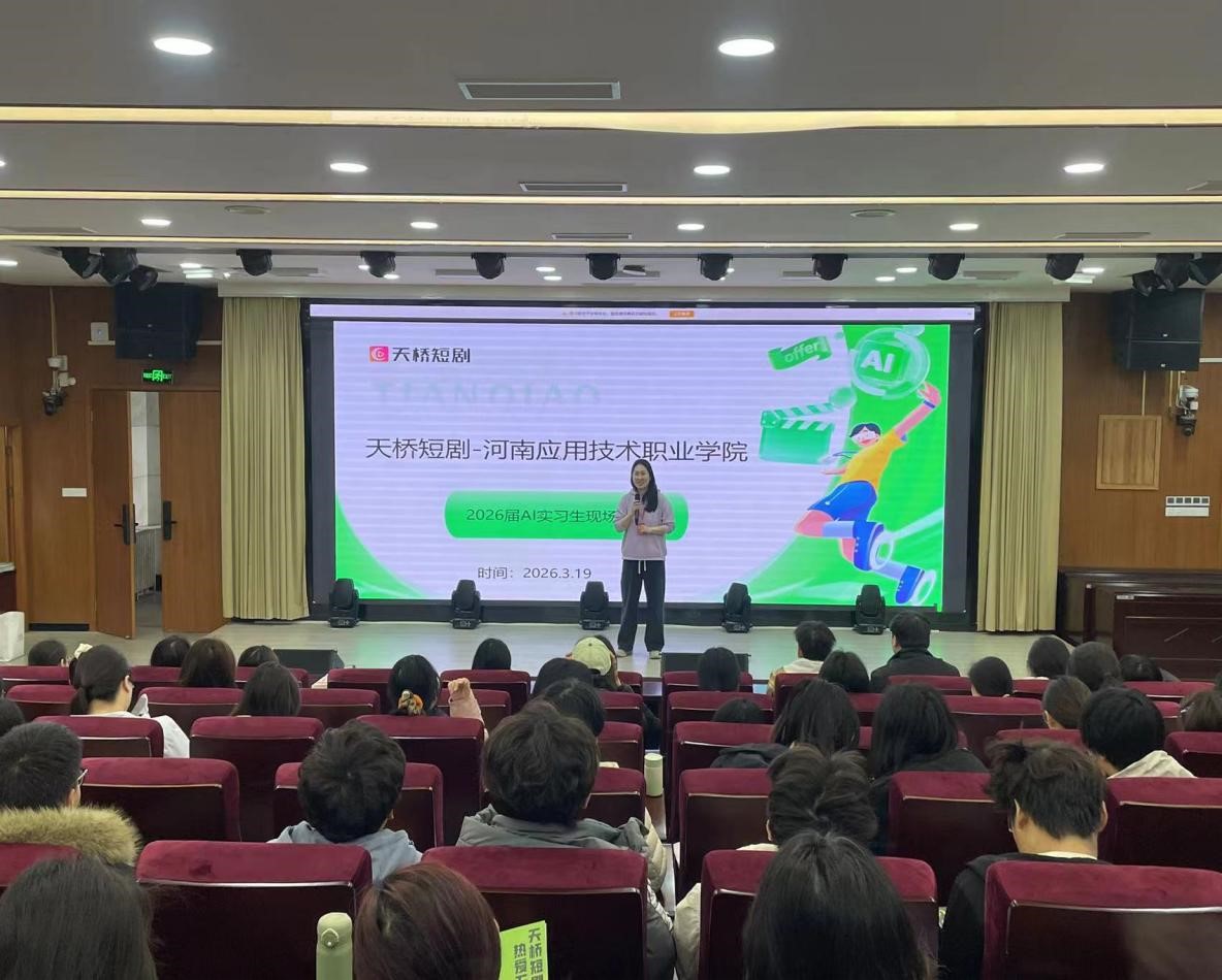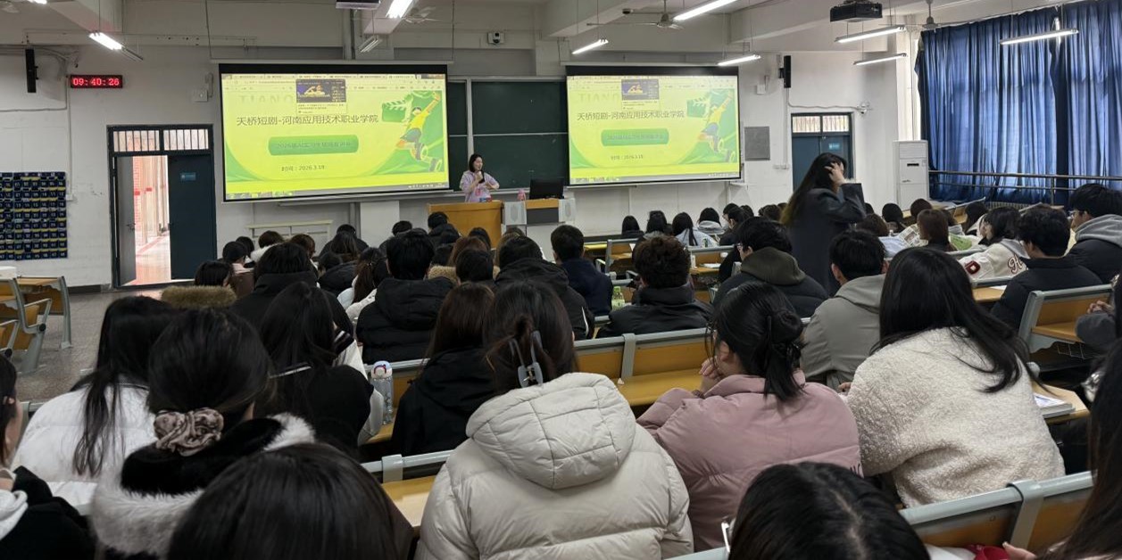 为进一步深化校企合作,拓宽学生实习、就业渠道,帮助学生更好地了解行业前沿动态,提升岗位适配能力,3月19日,天桥短剧走进我院,分别在C楼思政大讲堂和C102教室面向动漫制作技术、视觉传达设计两个专业的同学举办了两场专场宣讲会。